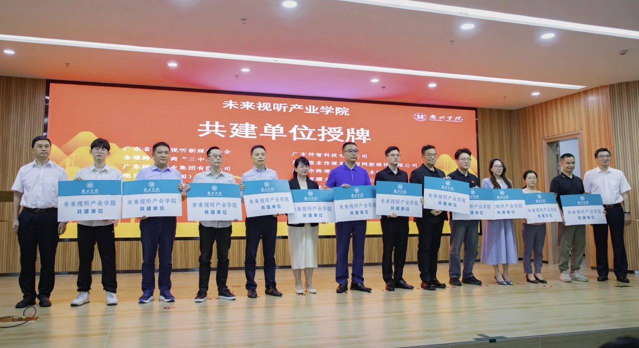 与会领导嘉宾共同为未来视听产业学院揭牌。彭永宏和王胜共同为广东省网络视听新媒体协会、全球跨境电商“三中心”、旭日商贸(中国)有限公司等首批12个共建单位授牌。